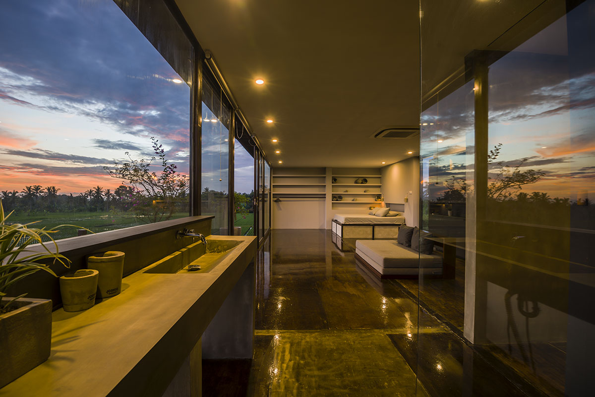 Two-floor villa made out of shipping containers with two separate bedrooms and a big swimming pool.
